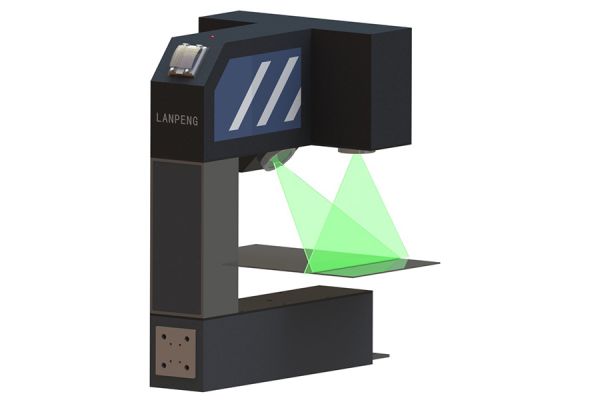 設(shè)備采用工業(yè)相機(jī)測量板材寬度。補(bǔ)光的線性激光垂直設(shè)置,工業(yè)相機(jī)傾斜設(shè)置,用于測量板面呈水平狀態(tài)通過的板材寬度。相機(jī)圖像的長度方向用于測量板材的寬度,圖像的寬度方向用于修正物距(被測物上下波動較大時,需增設(shè)激光位移傳感器跟蹤被測物的位置已修正物距)。設(shè)備主要配置上位機(jī)控制系統(tǒng)、外接數(shù)碼管顯示屏,根據(jù)需要可增配嵌入式智能模塊等。設(shè)備下部可配置剪刀叉升降平臺等輔助設(shè)備。